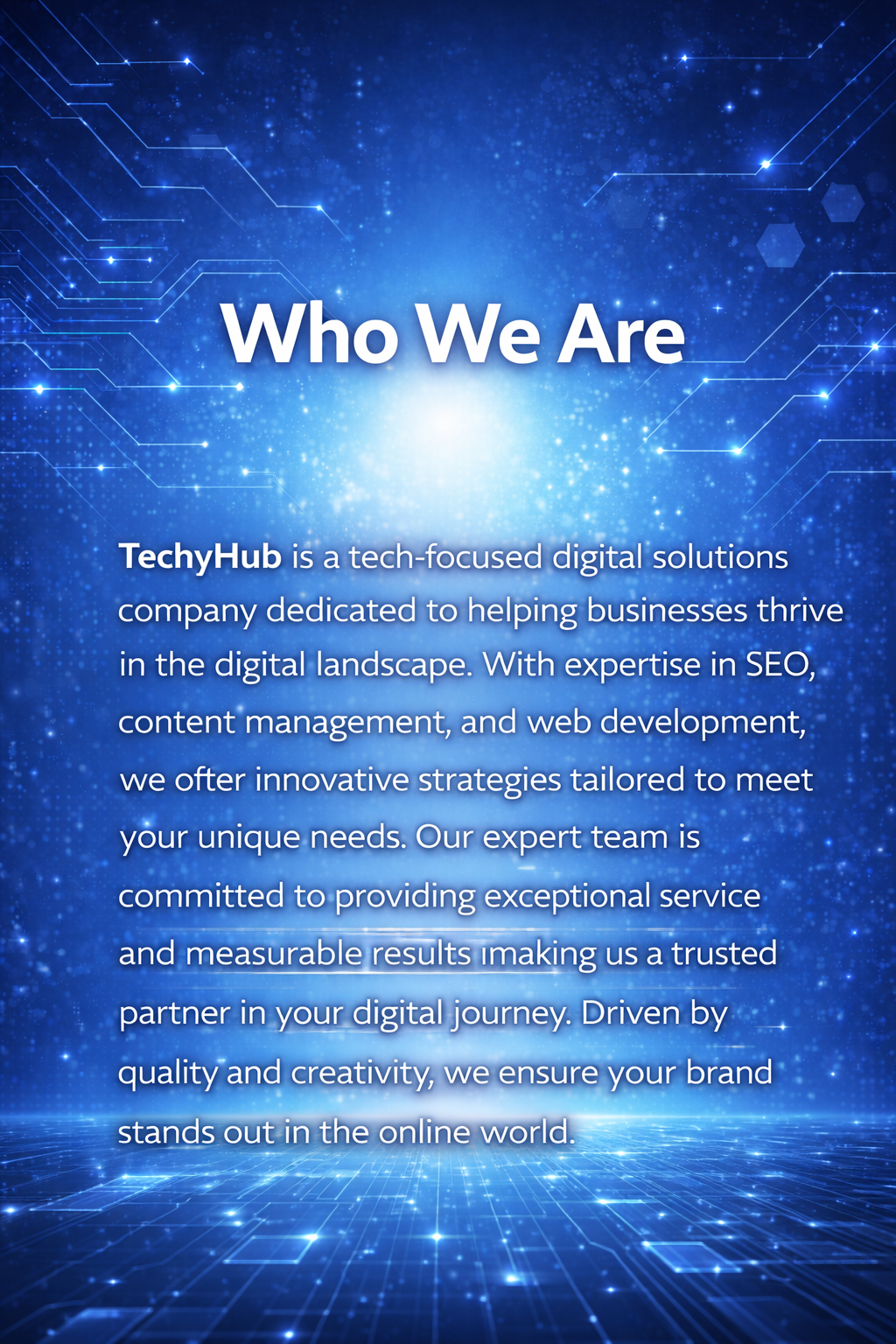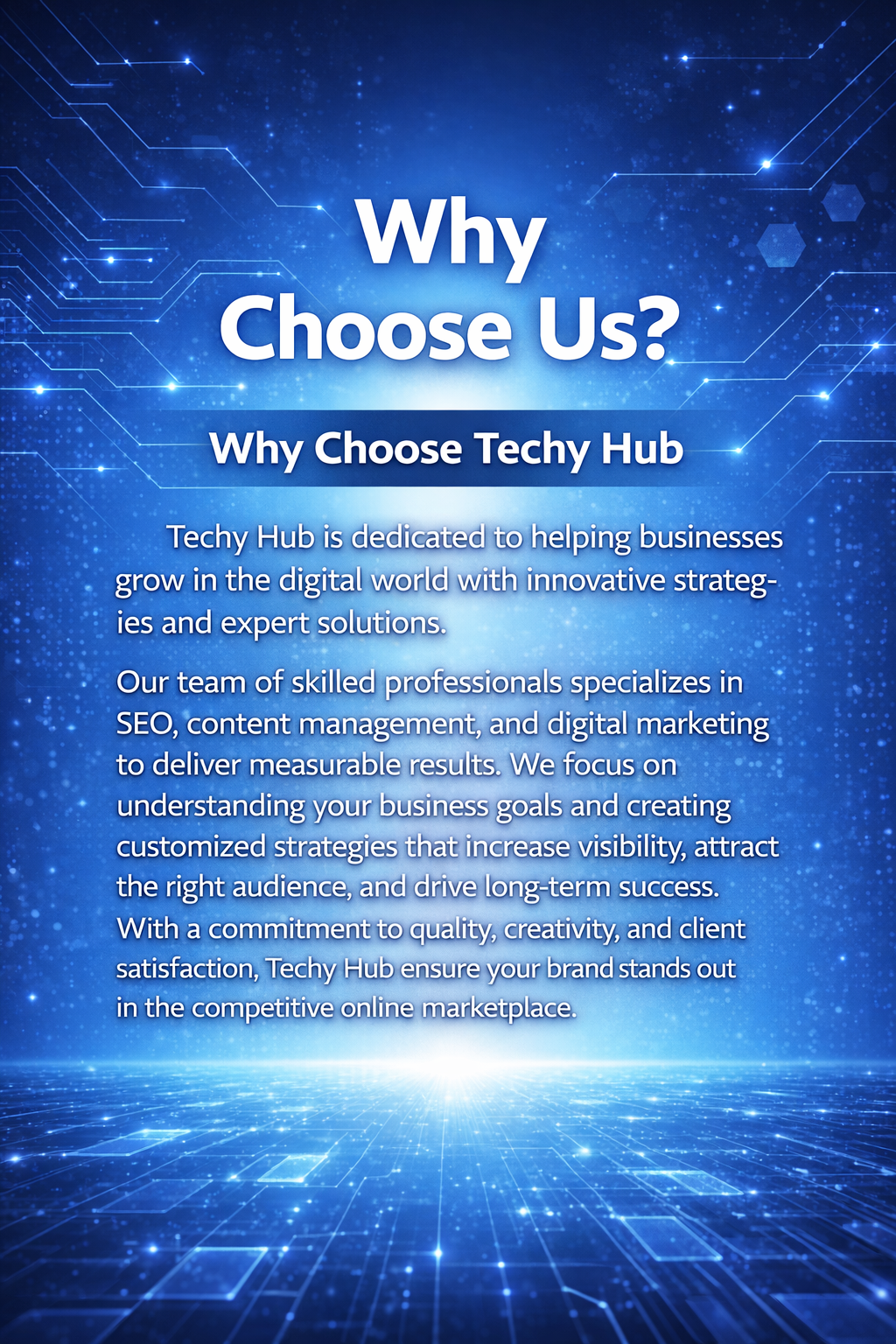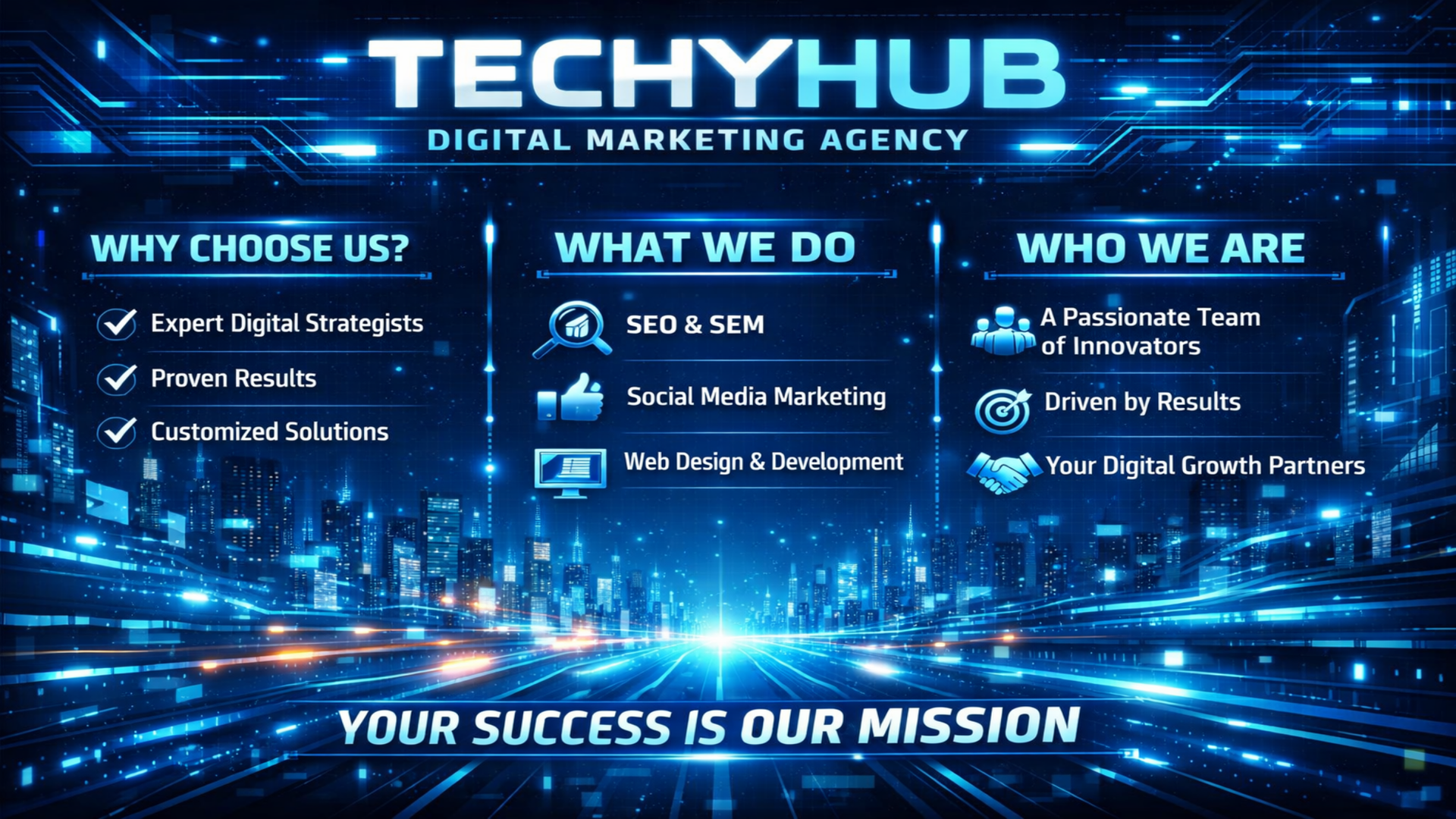 At TechyHub, our mission is to empower businesses with innovative, data-driven digital marketing solutions that accelerate sustainable growth. We aim to create meaningful digital experiences that strengthen brand presence and drive measurable results. By combining strategic thinking, creativity, and advanced technology, we deliver solutions tailored to each client’s unique goals. We are committed to transparency, collaboration, and performance excellence in everything we do. Our focus is on building long-term partnerships that enable brands to thrive in an ever-evolving digital landscape.