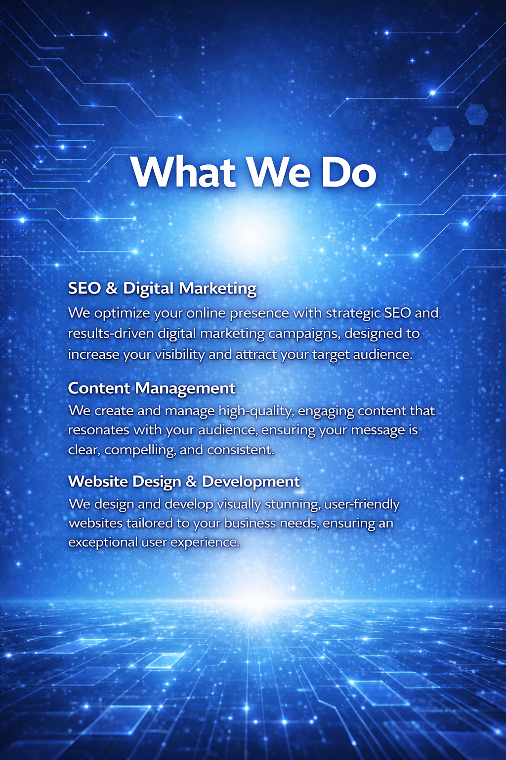At TechyHub, we deliver sophisticated digital solutions designed to help businesses establish, scale, and sustain a powerful online presence. Our focus is on creating high-performance websites and data-driven marketing strategies that align seamlessly with our clients’ long-term business objectives.